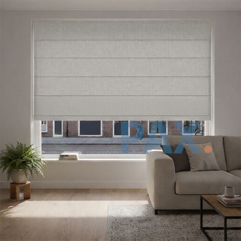 De vouwgordijnen worden exact op maat gemaakt tot 300cm breed en 300cm hoog.